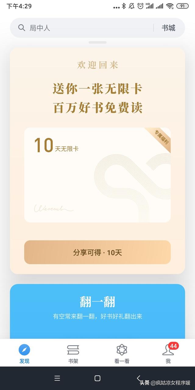 这个APP真的有如获至宝的感觉,他的模式是不卖书,卖时间。你每天都有一个小时的时间免费阅读,但是过了1个小时如果你还想再读,就要付费。对于我等落后生,每天一个小时够了哈哈。有的时候真是连一个小时的阅读时间我都拿不出来,我还有两个娃在身边。但是这个APP的理念真的很吸引我去阅读。